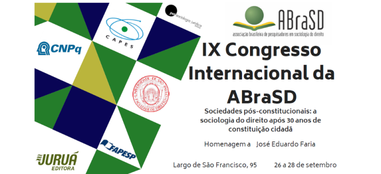 O Congresso Internacional (anual) da ABraSD (Associação Brasileira de Pesquisadores em Sociologia do Direito) de 2018 ocorrerá em São Paulo nos dias 26, 27 e 28 de setembro na tradicional Faculdade de Direito da Universidade de São Paulo (FDUSP) – Largo de São Francisco – 191 anos da sua fundação. As referidas instituições realizarão um evento internacional conjunto cuja temática girará em torno das Sociedades Pós-Constitucionais e os 30 anos da Constituição Federal de 1988, a sua eficácia social e, sobretudo, quais as conquistas já concretizadas e os desafios que a Sociologia do Direito enfrentará no Brasil.