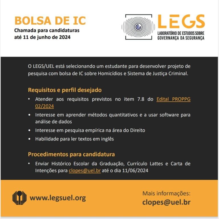 O LEGS/UEL está selecionando um estudante para desenvolver projeto de pesquisa com bolsa de IC sobre homicídios e sistema de justiça criminal. Acesse o edital AQUIhttps://sites.uel.br/proppg/wp-content/uploads/2024/03/Edital_ProPPG_02-2024_Iniciacao_Cientifica.publicacao.pdf